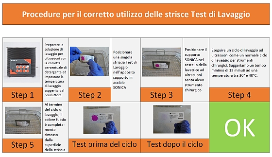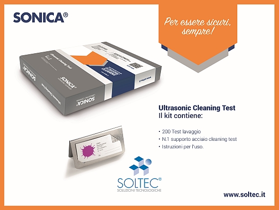Gli indicatori "Ultrasonic Cleaning test" distribuiti da SOLTEC Srl possono essere utilizzati per il controllo del processo di lavaggio di routine o per monitorare l'efficacia di lavatrici ad ultrasuoni con diverse configurazioni di lavaggio automatico.